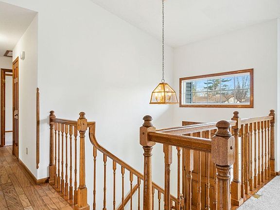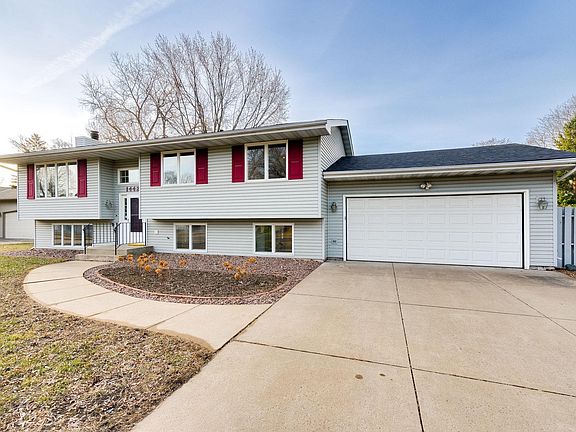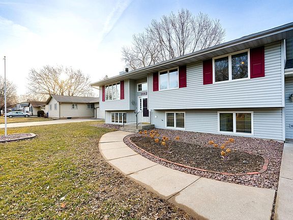 This lovely home bodes fresh paint and carpet, vaulted ceilings, lots of natural light, a large kitchen with spacious eat-in dining. Three bedrooms up with a bath on each level. The lower level has a second living room with a fireplace, built in office space, two additional bedrooms, laundry and attached garage access. Gorgeous deck off the kitchen provides easy access for eating al fresco, just as the weather is getting warmer! Fully fenced in, large yard with shed! At the end of the block a wooded trail brings you to Sherwood Park. 3 - 4 blocks from the local elementary and middle schools. On a quiet road tucked just minutes from Hwy 36 access, golf, Maplewood Mall, YMCA, shopping and more!