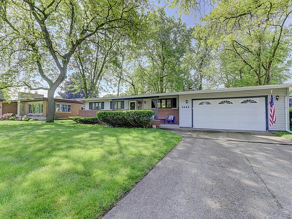 Welcome to this Mid-Century Modern home on a beautiful tree-lined street. This charming three bedroom, two bath home has so much to offer. There is a spacious Living Room with cathedral ceiling lines and recessed lighting. It shares a fireplace with the Dining Room. The eat-in Kitchen is equipped with double ovens, gas cooktop, dishwasher and refrigerator. The all seasons Sun Room with pitched ceiling detail overlooks the backyard and is open to the Dining Room. A large Recreation Room offers endless possibilities for use as a playroom, hobby room, exercise area, home office, etc. And, do not miss the storage that is adjacent to this room. The sliding door off of the Recreation Room opens out to the patio and fenced backyard. There are also three bedrooms: The Primary Bedroom offers a sitting area and is open to a tastefully remodeled three-quarter bath; Bedrooms 2 and 3 share a remodeled full bath. The Laundry area is part of the three quarter bath - very convenient! ONE YEAR home warranty offered with accepted offer.