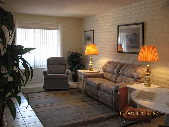 Available May 1st - October 31st. This unit is rented from November 2020 - April 2021. Enjoy all that Southern Arizona & GVR have to offer. A very warm & inviting 2 bedroom, 2 bath fully furnished townhouse is a wonderful home away from home. One resident must be 55 or older. This home has tile in main living areas with carpet in the bedrooms. Enjoy the serenity of your large shaded front patio with patio table & chairs. Living room is furnished with a couch, chair & TV. Dining area has table that seats 4. Kitchen comes complete including refrigerator, electric range, microwave, & dishwasher. Washer & dryer located off the kitchen. Lots of storage! Master suite has a queen bed, dresser, & a large walk in closet. The adjoining bath has a large shower. The guest room has a twin trundle bed & desk. The guest bath has shower/tub combo. GVR available, tenant pays fees. Easy walk to the GVR Rec Center & the Elks Lodge. Home has WIFI. Dog allowed with additional deposit. May-Oct rent is $1,000/mo. One month minimum for leases. Rates include all utilities, cable TV and internet. Unit is also available for an annual lease at $1,100/mo (utilities not included with annual lease). Owner pays water, sewer, electrical, gas and WIFI
