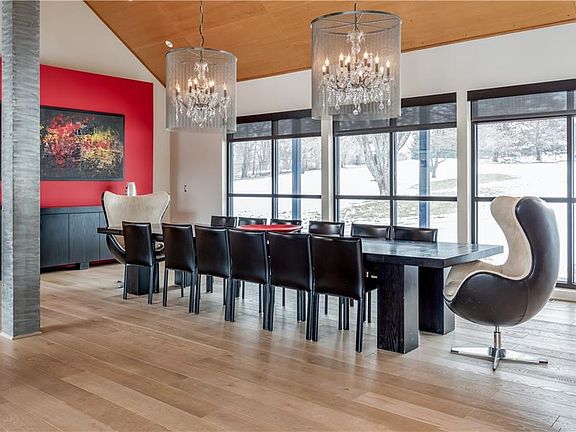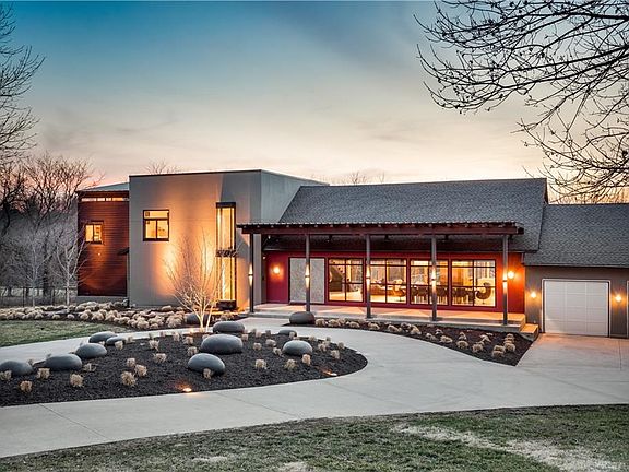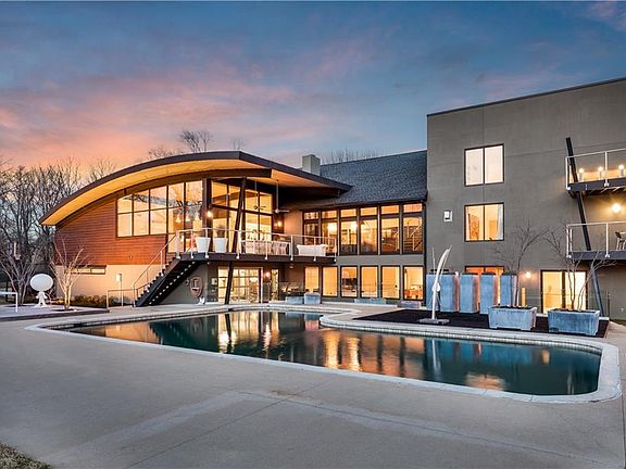 This remarkable contemporary architectural home is a must-see! A luxurious lifestyle awaits the special buyer of this estate combining modern nuances and stylish finishes. Nestled within mature trees on 7.84 acres in the heart of Leawood, this estate boasts every detail imaginable with bold dramatic accents. The backyard paradise is complete with multiple covered and uncovered outdoor terraces, a fire pit and beautiful subtle landscaping. The front and backyard both have fenced dog runs for your family pet with an enclosed heated and air-conditioned canine retreat. The heated pool adjoins generously sized decking. This 1.5 story home has unique materials such as wafer board, steel for the main level fireplace, commercial metal doors and aluminum garage doors, every single nook and cranny will be a conversation starter! This architectural masterpiece has 18 foot ceilings, sun drenched kitchen, tranquil owner's suite, two office spaces, remodeled clean sleek-lined kitchen, eye catching steel floating staircase & floor-to- ceiling windows with panoramic views of the landscaped property. Relax by the pool and listen to the soothing waterfall splash into the koi pond. 5 garages. Expansive LL boasts Rec Room w/unique wet bar, hobby room/workshop, home gym with garage door wall that opens to the backyard, fifth bedroom, and a game room poolside. Sizable secondary bedrooms - two with built-in lofts & sliding doors. This contemporary home is perfect for entertaining! This rare gem is a MUST SEE!