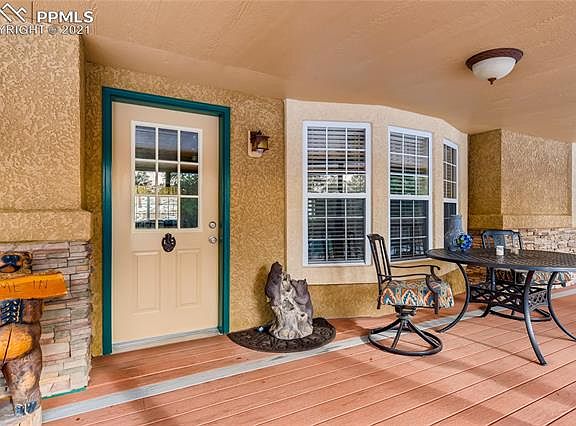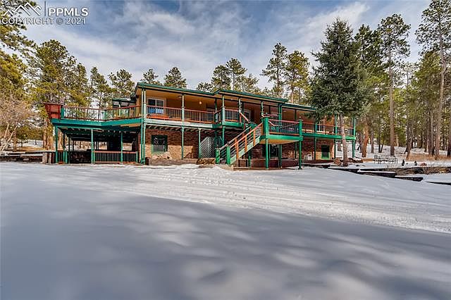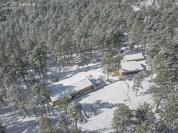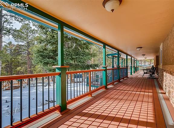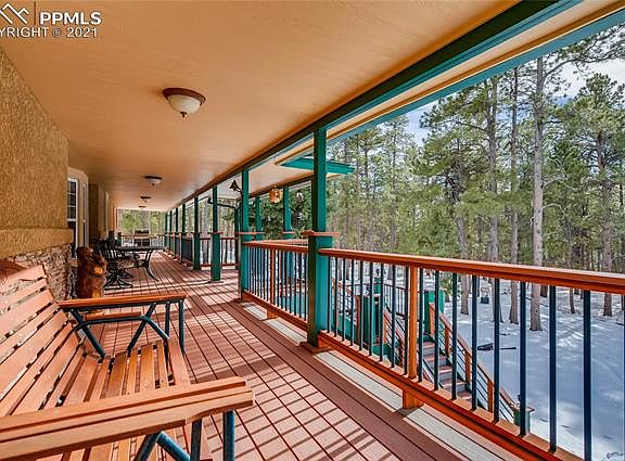 Welcome to fabulous Black Forest living with this approx. 3500 sf ranch home on 5.93 acres of amazing, old growth Ponderosa pine. Four bedrooms, three baths, dedicated office, with formals and a wonderful family/rec room with a full wet bar, this home's outside spaces is as impressive as its indoor living. Nestled among the towering trees and extremely tucked away and private, you drive down a private land to the gated entry and full perimeter fencing. Upon entering, you will see four outbuildings ready for cars, toys, and other hobbies. The main garage (32x44)is insulated/finished/heated w 100 amp elec, and the tandem feature offers a fabulous work shop space, the second garage (24x40) w/insulated walls, power, third building has partially insulated walls and ceiling, and the fourth is a pole barn (24x40) w/insulated roof. All w/metal roofs. Don't forget 2 RV pavilions of 20x36 and 16x28. Outside entertaining is sublime with paving stones, retaining walls, & gathering spaces plus amazing deck features that step to the front door inviting you in. The home is Colorado warm with hand scraped wood floors, tongue in groove ceilings and a wonderful sit down bar to enjoy watching the chef. Also featuring that hard to find 3 main level bedrooms, updated baths, and a master bath custom, 'Old World' vanity. Downstairs, enjoy the bar area, another bedroom and bath plus woodburning stove perfect for TV nights. 2x6 consttuction, two furnaces, a/c on main level. Home is a joy to show and if you want to be a world apart, this is it. No covenants, so bring those animals and hobbies. Amazing covered deck (8x66) that wraps around to an uncovered deck of (16x27)complete with a dry bar, fridge, and propane fire pit, All composite plus composite stairs and iron railings. County records show home being built in 1984 with an effective year of 1995. Close to elementaries, parks, and only minutes from shopping. Come and enjoy