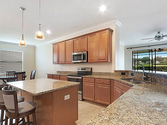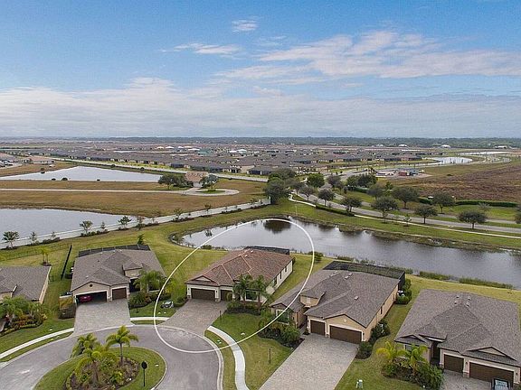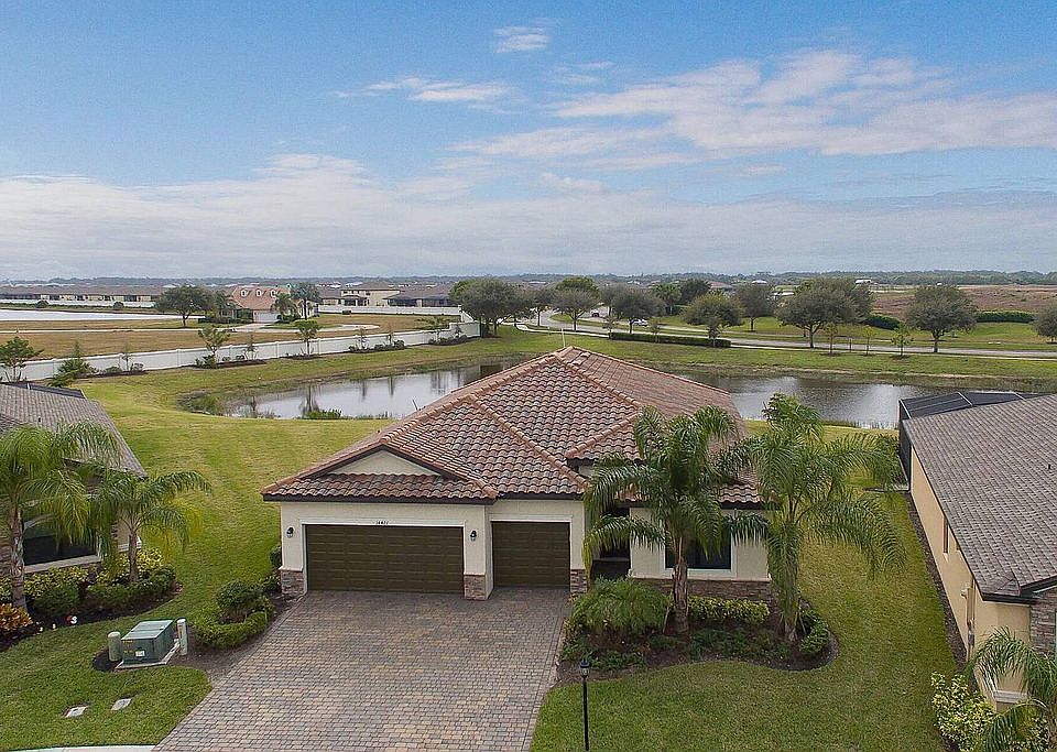 Highly desirable Portico community home with 4 Bedroom 3 Full Bath, pool & spa on a premium waterfront lot overlooking lake with no homes behind property for ultimate privacy. Spacious open concept fully upgraded with tile & crown molding throughout. Oversized chef's kitchen with upgraded cabinets and granite countertops, overlooking breakfast nook and large dining room. The great room overlooks pool and lake, perfect for entertaining friends & family. The lanai and pool features freshly sealed pavers. Stately master bedroom suite offers very large walk-in closets and spacious full bathroom with granite countertop. Guest suite or office features it's own private bathroom with granite countertop. Two guest bedrooms share a full bathroom with granite countertop. The 3 car garage includes epoxy floor finish and exterior is upgraded with brick finishes and tile roof, freshly sealed driveway pavers. Low HOA dues with access to NEW community pool & clubhouse, large state-of-the art fitness center, landscaping & lawn maintenance. *Virtual tour available *Buyer Broker 3% *Price is $412,000 with buyer broker
