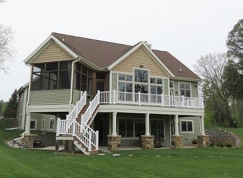 Luxury lake living!2 levels of custom designed living space taking full advantage of lake access & views.3 bdrms, 3 full baths.2.5 attached garage plus an add'l 32 x 32 garage for all the lake toys! Stunning vaulted ceilings, floor to ceiling stone fireplace, deluxe master suite w/ WIC & steam shower. Finished walk-out lower level w/ rec area, home theater room, office space and bar w/ wine fridge. Located on a quiet bay with 104' of lake frontage. Control 4 smart house audio / video system throughout!