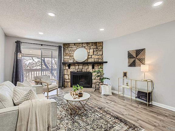 Welcome home to this light and bright condo in Aurora! The home is move-in ready with modern upgrades throughout. Walking in you are greeted by a large living room with a gas fireplace and oversized balcony. There’s an open floorplan with the living room adjacent to the dining area and kitchen. The kitchen has new countertops and fixtures, luxury vinyl plank flooring, storage shelving, and lots of counter space. The home also features a large bedroom with walk-in closet, and a laundry area with included washer and dryer. The bathroom has been fully remodeled with new tile, flooring, fixtures, glass shower door, and new lighting. You will love using this relaxing bathroom every day! The home sits on the top level of the unit so there are no potentially noisy neighbors upstairs to worry about. The home is complete with a detached one-car-garage and reserved parking spot in the lot behind the unit. The community features a pool, playground, basketball court, pickleball/tennis court, and covered picnic area for entertainment and fun! You will love living in this quiet community close to ample shopping, schools, parks, and walking trails!