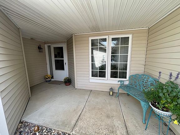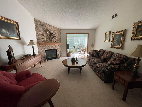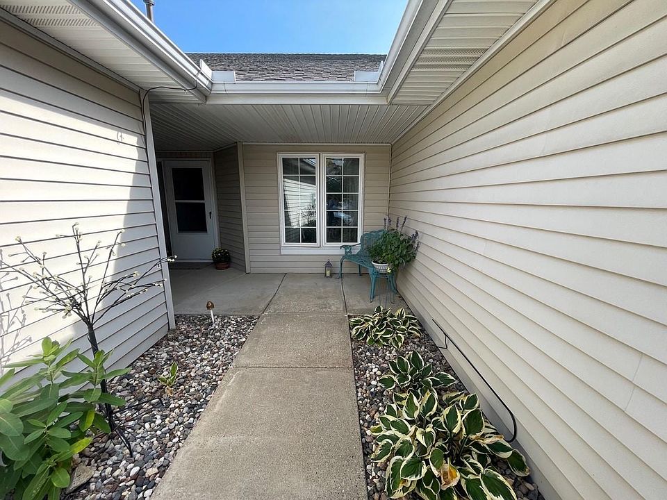 This FRESHLY PAINTED 2BR 2BA one-level living townhome is inviting, comfortable, and offers a maintenance-free exterior for easy living! If you love to travel, you can simply lock up and go! Vaulted ceilings give a wonderful sense of space throughout this home. The vaulted kitchen has NEW STAINLESS APPLIANCES, a skylight and wood-style flooring, an elevated-height peninsula, glass cabinets and new hardware. The vaulted family room has a gas fireplace with new dry-stack stone surround and opens to a vaulted 4-season sunroom in restful color palette. The home includes two bedrooms, including a primary suite with a walk-in closet and private, freshly painted 3/4 bath. Another full bath lies near the additional bedroom. The neighborhood of one-level homes is located within 2-3 minutes of shopping, restaurants, grocery stores and fitness centers. Additional features include a patio with privacy fencing, NEW AC (6/2023), a newer water heater and a garage workbench + storage shelving.
