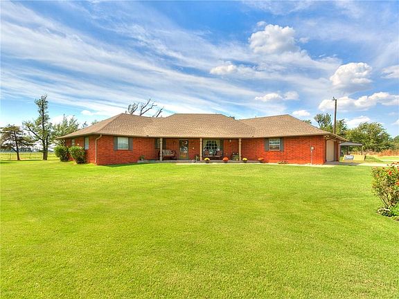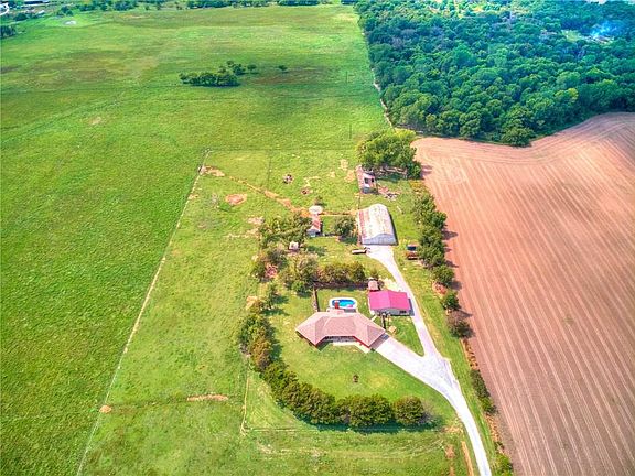 **Realtors bring your clients! Willing to pay buyers realtor 3% commission fee** Peaceful, country living on 10 acres. The home is approximately 2300 sq.ft with an 840 sq.ft attached garage. Updated kitchen with new quartz countertops. The front and back porches offer a beautiful view of the property. The home has 3 bedrooms, 3 bathrooms, and a 2nd living room or office. A heated in-ground pool was installed in 2017. An insulated 24x30 barn was purchased in 2018 and is used for a pool house/game room. It has 2 covered porches and a brand new mini-split heat and air system. There is a 20x40 cowbarn with a corral and a 50x80 round top barn, both concreted with electric. An in-ground storm shelter was recently installed and the lateral lines have been replaced. The home has a dual fuel heat pump with propane backup. To learn more or to view the property please contact Houston Rhoades at 405-664-2458.