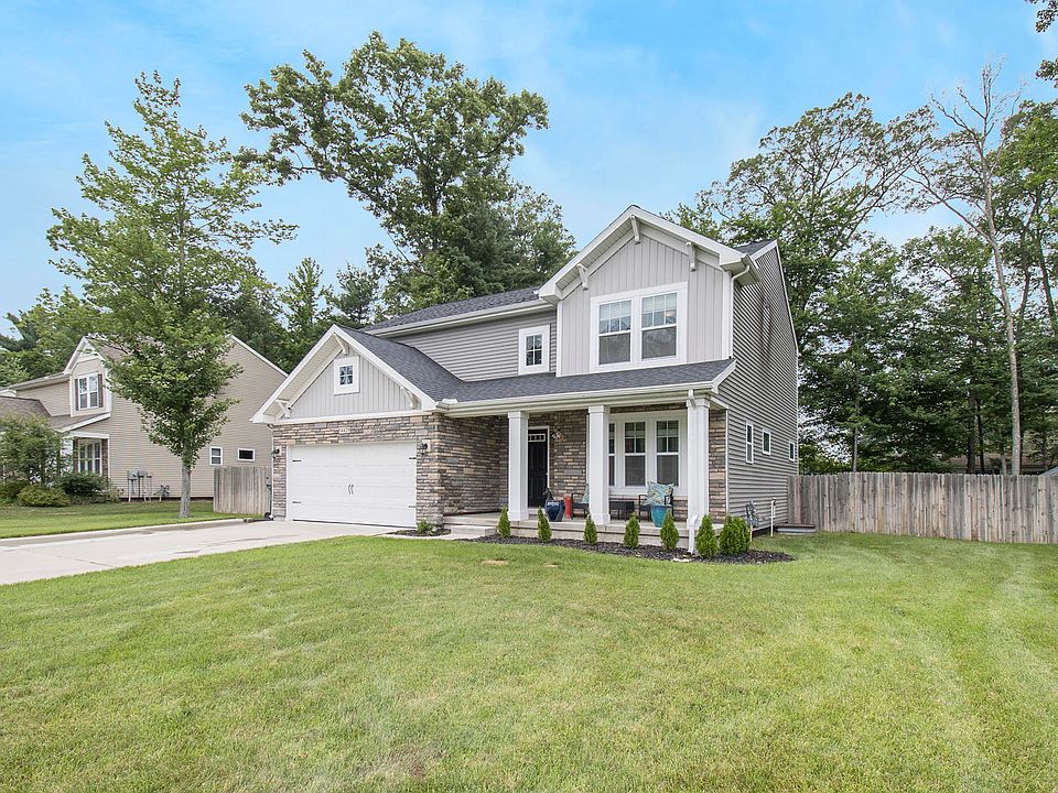 Welcome to Brigham Woods in Grand Haven! Spacious 4 bedroom 2 1/2 bath 2 story home complete with full basement, 2 stall garage, large deck and a beautiful back yard! Main floor boast large living area, open kitchen dining area with laminate floors. Kitchen has solid surface countertops, beautiful bcabinets, island & pantry Bright and sparkling kitchen includes beveled subway backsplash, granite counters, pantry, slate-finish appliances, new microwave (2021), and convenient access to the garage, mud entry, back paver patio & fire pit! Deluxe master suite features private bath and smartly outfitted WIC with melamine organizers! Unfinished lower level is prepped for 5th bedroom w/ egress window already in place.