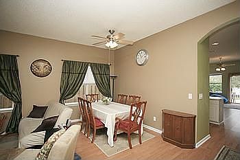 All you'd expect & more from this fabulous lake front home! As you enter, the foyer opens up to the large living/dining combo, as well as the 4th bedroom which is commonly used as an office. No carpet in this home - laminate flooring throughout & tile in baths/laundry. The master bath includes walk-in closet, garden tub, separate shower & double sinks. Spacious kitchen features white cabinets, stainless appliances, food prep island, large pantry & plenty of counter space. Huge, fully fenced back yard with oversized patio backs to natural spring fed lake! Other extras include: extra shelving in laundry & garage; water softener; security system; high ceilings; large closets & so much more!