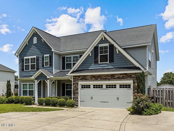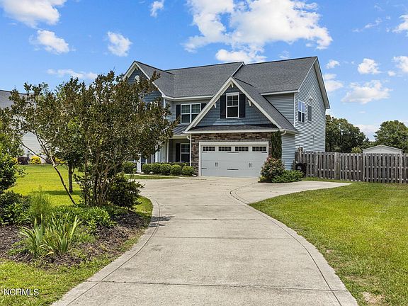 This stunning property offers an array of luxurious features and ample space for comfortable living. As you step inside, you're greeted by an elegant living room and a formal dining room adorned with exquisite 2-panel wainscoting and coffered ceilings. As you pass the first floor office and bedroom, the spacious family room boasts a cozy gas log fireplace and a built-in dry bar serving cabinet, perfect for entertaining guests. Ample storage from builtins keeps the space tidy. The eat-in kitchen is a chef's delight, featuring a convenient work island with pendant lighting, granite countertops, and tile backsplash. Convenience meets functionality with a mudroom off the 2-car garage and a large laundry room with a basin. Additionally, there's a full bath on the main level, offering versatility for your lifestyle needs. Upstairs, the second level opens to a grand landing leading to a hallway that provides access to the master bedroom suite, complete with two walk-in closets for ample storage. You'll also find a spacious bonus room with large closet storage space, perfect for a playroom or home office. Three additional bedrooms and a hall bath offer plenty of room for the whole family. Plus, there's a hall storage closet that can accommodate a second washer and dryer, adding to the home's convenience. Outside, you'll appreciate the expansive 1.12-acre lot, fully fenced in the back for privacy and security. Let the kids run and play while your furry friends roam freely. At the back of the lot, a three-bay garage provides ample space for all your recreational vehicle, storage, or workshop needs. Enjoy outdoor living at its finest with a covered front entry porch, a screened back porch, perfect for relaxing and entertaining year-round. With the added bonus of a whole home generator, you can rest easy knowing you'll never be without power during storms or outages. Located in a prime area, you'll have easy access to all the amenities and beaches of the Crystal Coast.