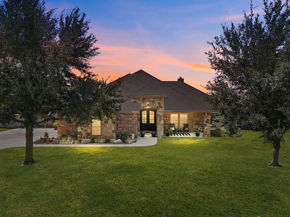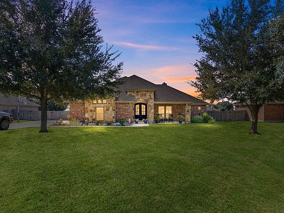 Upgraded one story brick home on a spacious half-acre lot in highly sought after Navarro ISD. This beautifully updated residence features renovated kitchen and bathrooms, neutral tones, high ceilings, and a stone fireplace that anchors the open living space. The kitchen is finished with quartz countertops, stainless steel appliances, and a large island with breakfast bar seating. A separate dining area offers abundant natural light and views of the private yard. The south wing includes three bedrooms with a shared full bath, while the private primary suite boasts a spa like ensuite with double vanity, standalone soaking tub, walk-in shower, and generous walk-in closet. A farmhouse style laundry room with an additional half bath is conveniently located near the garage.