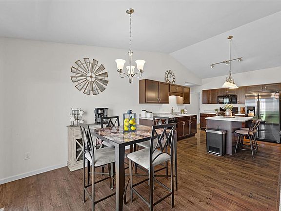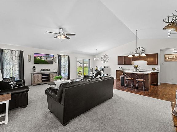 Step into this beautiful 3 Bed/2 Bath home in sought after Riverdale Village. The Open floor plan includes a Great Room w/vaulted ceiling, leading to the Kitchen with Center Island/Brkfst Bar, 42in. custom cabinets, backsplash, quartz countertops, and walk-in pantry. The Breakfast Area then leads out through sliding doors to a huge patio complete with an outdoor Fireplace. This divided floor plan includes a Master Suite with full Master Bath and Walk-in Closet on one side, 2 additional bedrooms & guest bath on the other. Main floor Laundry. The finished basement has luxury vinyl plan flooring throughout with a large recreation room area, exercise room, and full bath w/shower. Wait, there's more! This house has an oversized 30X22 Garage with shelving, ceiling fan and a 30-amp all performance plug included. Decorative Pavers lead you to the back patio from the garage. Riverdale Village has acres of common ground, 2 parks, and 3 lakes making this a perfect place to call home.