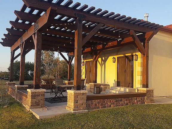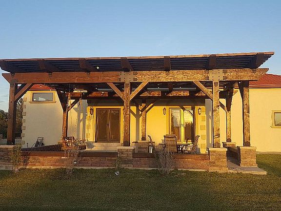 Check out this gorgeous custom built home located just outside city limits of Lakin, KS. The attention to detail on this home is incredible! It boasts a private courtyard at the entrance with heated concrete, built-in gas grill, a huge natural gas fire pit within a water fountain, and an outdoor television. This open floor plan has 12ft ceilings on the main floor and 9ft ceilings in the basement with beautiful arched doors and windows on the east for natural lighting. Custom built-in appliances, marble countertops, and beautiful ceramic flooring make for a perfect kitchen. The west side of the house features a stunning pergola perfect for entertaining and enjoying a Kansas sunset. The master bedroom has a huge walk-in closet and a bathroom with a walk-through shower. Outside you have approx 14.6 acres of land and a 80x40 horse barn and tack room with power supply for your horse trailer.