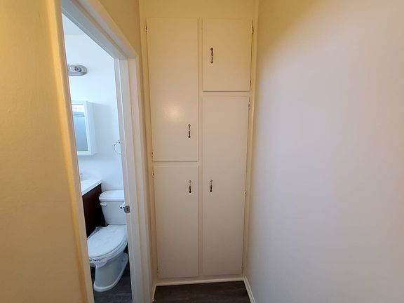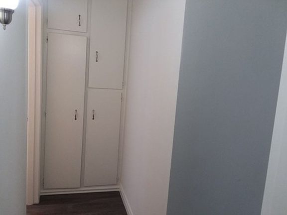 Two tones paintPlank wood floorFull bright bathroomGarbage disposalExtra closetStainless double sinkLinen cabinets in hallway