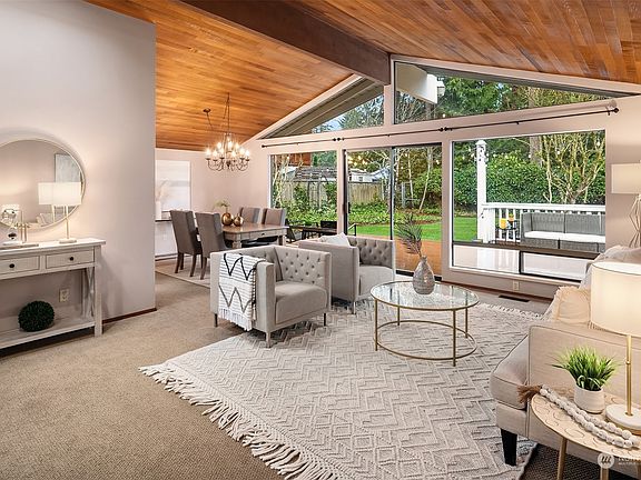 This beautifully updated rambler in the desirable Briarwood neighborhood features a spacious, circular floor plan that's perfect for entertaining & everyday living. Enter the light-filled living room with a stunning floor-to-ceiling brick fireplace, vaulted cedar-plank ceilings, & a wall of windows overlooking the deck & private backyard. Pass into the completely remodeled kitchen which features quartz counters & stainless appliances into a large open living space with a cozy fireplace, & access to a separate patio. 3 oversized bedrooms, including the primary with remodeled spa-like ensuite & large closet space. Sitting on a quarter-acre lot of mature landscaping, just minutes to 169, I405, & all the amenities of the East Renton Highlands.