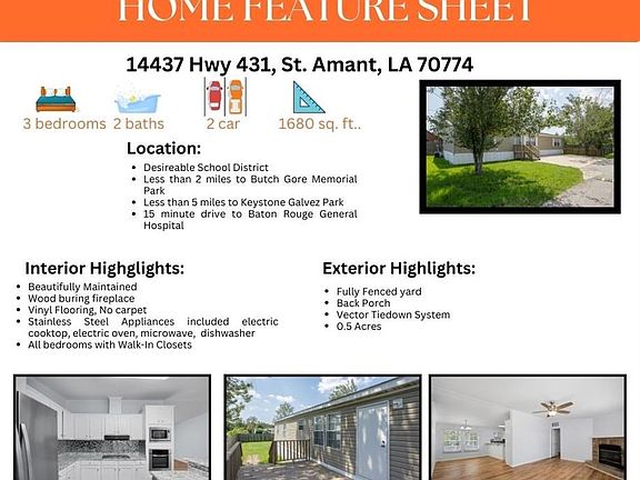 Updated double-wide manufactured home on 0.5 acre in a desirable school district! This 3-bedroom, 2-bath home features a wood-burning fireplace, stainless steel appliance (all approx. 5 years old), and thoughtful upgrades throughout including sheetrock walls, spray foam insulation, and durable vinyl flooring with no carpet. this kitchen offers an electric cooktop, wall oven, microwave and dishwasher. The main bedroom includes a versatile bonus room-possibly used for a nursery, home office, workout space or dressing room. Enjoy outdoor living on the back porch overlooking the privacy-fenced yard, with a paved 2-car driveway for convenience. Additional features include a vector tie-down system and location in the sought-after Lake Elementary, Lake Primary and St. Amant High school zones.
