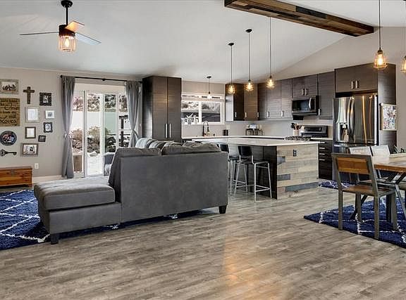 Beautifully updated rambler with a large open floor plan. Main floor living area and kitchen were all recently updated with a new open concept design, new floors and paint throughout, new cabinets and large kitchen island with quartz countertops. All kitchen appliances included. Primary bedroom is roomy and features an en suite with granite double vanity sinks and a walk-in closest. Basement has been partially framed and is ready for you to add your special touch. Backyard has a patio with a newer pergola and is fully fenced with beautiful Mountain View's. In addition, a New roof in 2021 (30 yr and rated for high wind!); an RV pad with 30 amp RV outlet; New garage door opener and garage door assist springs in 2021; and New high efficiency dual stage furnace w/ 4 " filter box & New A/C. Square footage figures are provided as a courtesy estimate only and were obtained from previous MLS listing. Buyer is advised to obtain an independent measurement.