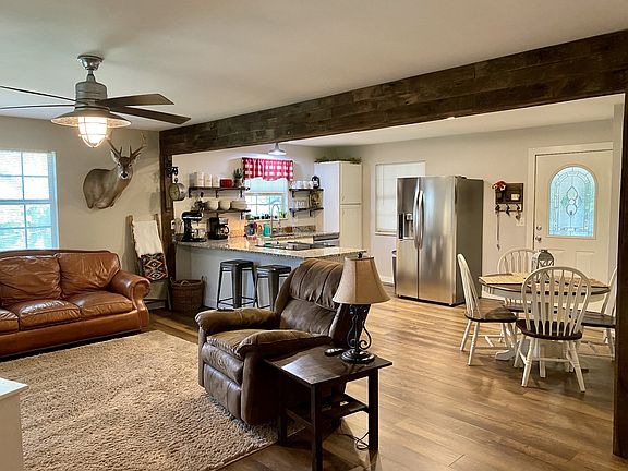 Country setting yet minutes from town! Beautiful property with 2 creeks, 5.89 acres and mature trees. Remodeled kitchen with new cabinets, granite counters, open shelving. All appliances remaining. New flooring throughout and updated guest bath in 2017. 24 x 30 detached garage with concrete floors and electric. Must see!