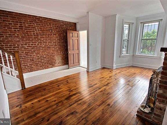 3 BR, 1.5 BA, built in 1910. Interior contains exposed brick walls and original pine wood flooring throughout. Living room has fireplace and bay window, connecting into the formal dining room, with large shelving, exposed brick, fresh paint, and an additional fireplace. Kitchen features new stainless steel appliances including an oven, refrigerator, dishwater and microwave, new granite counter-top