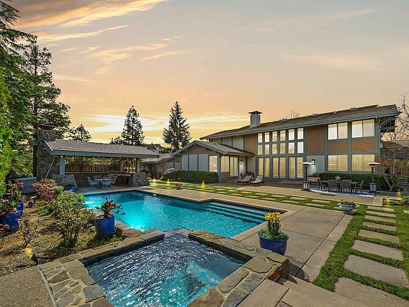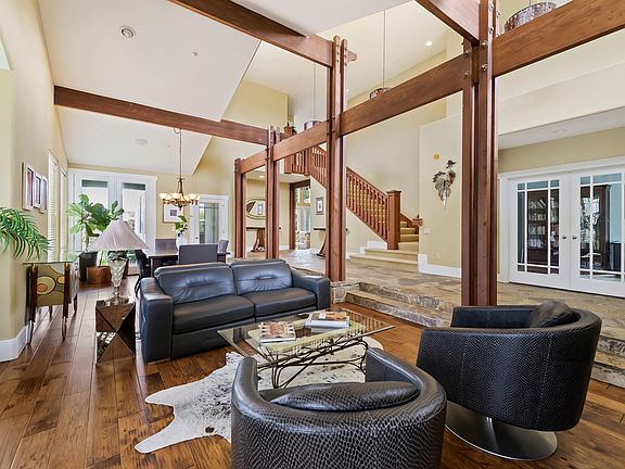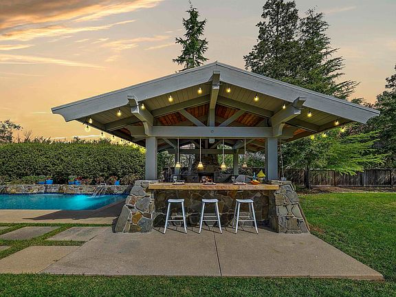 Tahoe inspired, it includes a newly minted $200k+ modern kitchen, adorned with a striking leather-front Sub-Zero refrigerator, freezer, and wine cooler, alongside Miele and Cove appliances. The centerpiece, a lighted quartzite island, sets the stage against the backdrop of mesmerizing vineyard views and dynamic living areas. The main level is crowned with a primary suite that radiates luxury, featuring vaulted and beamed ceilings, and a contemporary bath with a freestanding tub boasting heated backs, NuTone heated floors, and bespoke cabinetry and lighting. Also on the main level is an office or fifth bedroom, as well as another full bath. Upstairs, there's space for everyone with a junior primary suite and two more bedrooms sharing a Jack and Jill bath, plus a large bonus room with its own en-suite bath. Outside, the fun continues with a refreshed pool, a cozy cabana with an outdoor kitchen and fireplace. With both 3-car attached and 2-car detached garages and a courtyard driveway there is room for all. Gated neighborhood.