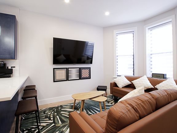 Experience the pinnacle of luxury living in this one-of-a-kind, semi furnished brownstone. This spacious 3-bedroom, 2-bath residence features 1,000-square-feet of interior living space and a private 500-square-foot furnished backyard. This beautifully designed residence features an open kitchen with a bar area, complemented by a spacious living and dining room. Magnificent bay windows and 10-feet ceilings create a bright, airy atmosphere, enhanced by contemporary light fixtures. The primary bedroom offers a luxurious en-suite bathroom. Each bedroom is outfitted with a TV mounted beside a mural and eight-foot solid-core doors. The marble bathrooms are equipped with deluxe rain showers for a spa-like experience. Amenities include a package room, in-unit vented washer/dryer, 4-zone cool/heat system, all enhanced by a high security system & keyless entry. Steps from Lincoln Terrace Park, and just two blocks away from the 2/3/4/5 subway lines, you're effortlessly connected to the best of NYC - 30 minutes to FiDi, 15 minutes to Barclays, and only 10 minutes to the Brooklyn Botanical Gardens and Prospect Park. This is the perfect blend of luxury and convenience. _ A non-refundable rental application and credit check fee of $20 is required per applicant and/or guarantor. Additional move-in costs include the first month's rent, a security deposit and a pet deposit (if applicable).