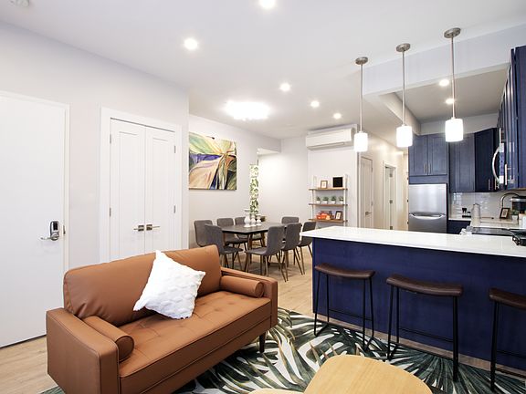 Experience the pinnacle of luxury living in this one-of-a-kind, optionally furnished brownstone. This spacious 3-bedroom, 2-bath residence features 1,000-square-feet of interior living space and a private 500-square-foot furnished backyard. This beautifully designed residence features an open kitchen with a bar area, complemented by a spacious living, dining room and office nook. Magnificent bay windows and 10-feet ceilings create a bright, airy atmosphere, enhanced by contemporary light fixtures. The primary bedroom offers a luxurious en-suite bathroom. Each bedroom is outfitted with a TV mounted beside a mural and eight-foot solid-core doors. The marble bathrooms are equipped with deluxe rain showers for a spa-like experience. After a long day, unwind in your private furnished backyard and take in the beautiful summer nights. Amenities include an in-unit vented washer/dryer, 4-zone cool/heat system, all enhanced by a high security system & keyless entry. Steps from Lincoln Terrace Park, and just two blocks away from the 2/3/4/5 subway lines, you're effortlessly connected to the best of NYC - 30 minutes to FiDi, 15 minutes to Barclays, and only 10 minutes to the Brooklyn Botanical Gardens and Prospect Park. This is the perfect blend of luxury and convenience. _ A non-refundable rental application and credit check fee of $20 is required per applicant and/or guarantor. Additional move-in costs include the first month's rent, a security deposit and a pet deposit (if applicable).