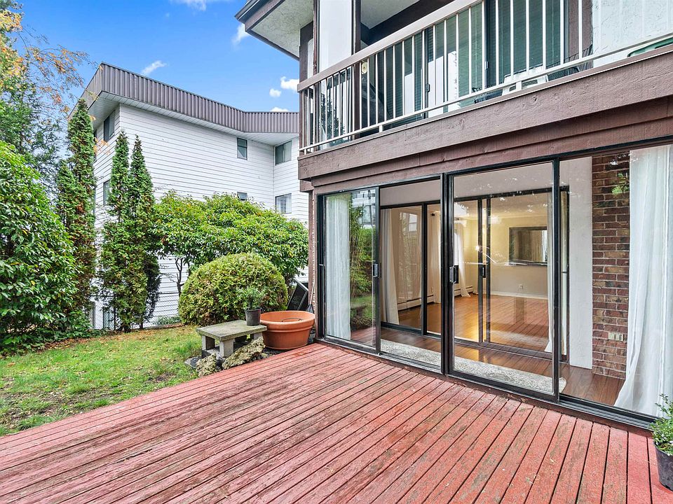 Come have a look at this expansive ground level corner unit home located in one of White Rocks most desirable locations, steps to the peninsulas best shops & restaurants. Deciding whether to dine & shop at beach or White Rocks uptown will be your greatest concern. This efficient floor plan with oversized bedrooms on either side of the home & massive living room feels larger than its measured 910 sqft! The recently updated bathroom with custom walk-in shower & bench seating is great for those looking to maintain independence! With its updated kitchen with full size stainless steel appliances, laminate floor throughout, and new drapes this home is move in ready! Enjoy the morning sun in what feels like a backyard with 215 sqft sun-deck! 1 parking/1 storage Open House Cancelled.