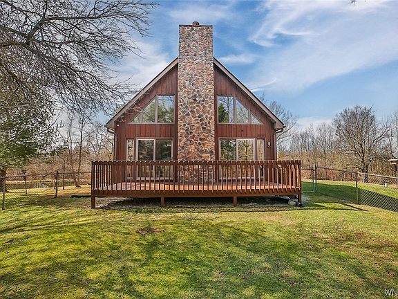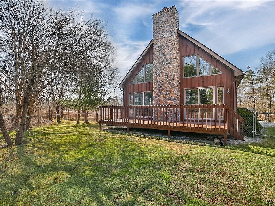 Spectacular and well cared for two-story Chalet style home set back from the road on 2.4 acres. Beautiful and private grounds feature a large pond, newer two car garage with additional parking pad and fabulous 23 x 20 deck with full 2-story stone fireplace facade. Soaring two story windowed great room with fireplace and double sliding doors to backyard deck. Living room/den on first floor along with two bedrooms and a full bath. Large cathedral ceiling primary bedroom upstairs with vaulted ceiling full bath and double closets along with sliding door to outside porch. Second floor also features an additional loft overlooking great room. Kitchen feature updates including quartz countertops. Floors include both hardwood and luxury vinyl along with updated carpets. Other updates include newer driveway, roof 2010, fireplace 2023, newer boiler and tankless hot water heater in 2018. Large poured concrete basement. A truly magnificent home. Seller has chosen to implement a Listing Delayed Negotiation to Tuesday 3/12/24 at 6 pm.