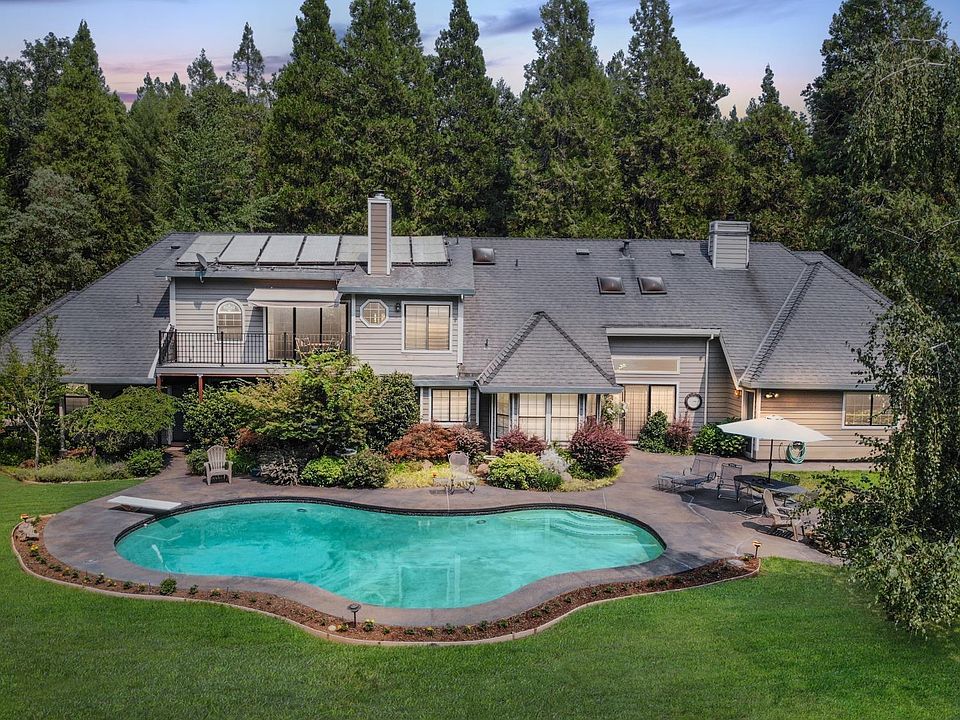 Nestled away in the trees of Nevada City on Banner Mountain, This captivating five bedroom, three bath SIX car garage awaits. Vaulted ceiling in the livingroom along with all upstairs rooms. Bright large windows & skylights to welcome natural light throughout. The kitchen has granite counter tops, dining area, large bay window for casual eating, plus a formal dining area. Spacious rooms for hosting and serving large gatherings inside and out by the solar heated pool area. Upstairs holds the master bedroom with sitting room and office with large walk-in closet with TONS of storage with fireplace and a private lanai. Master bathroom has jetted tub and a shower stall. Explore the stunning backyard that has a built in pool, concrete patio, and an oasis of years of gardening that blooms all year long. This property has so much to offer, come fall in love and stay awhile.