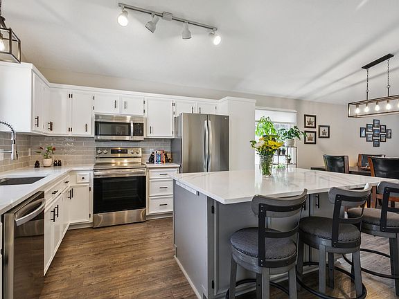 Quality craftmanship in this renovated rambler home in Savage. With over 2,000 finished square feet, this four-bedroom, two-bathroom home has an oversized two-car garage on .43 acre. The vaulted, open concept main level includes white cabinetry, doors and trim, updated lighting, LG stainless steel appliances, quartz countertops, luxury vinyl plank flooring, an electric fireplace and French door to the maintenance-free deck. Main level primary bedroom with dual closets, a second bedroom with shiplap accent wall; as well as one full bath. Lower level has two bedrooms with egress windows and a three-quarter bath, a spacious family room anchored by a beautiful stacked-stone gas fireplace, and a large egress window that brings in natural light to the space.