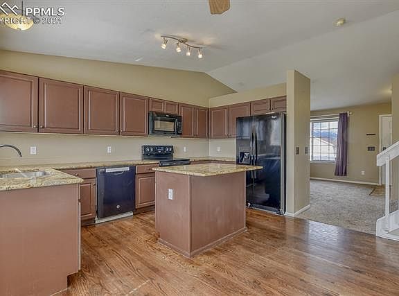 Beautiful tri-level home in the area of Horizon that features 3 bedrooms, 2 bathrooms, 2-car garage and views of Pikes Peak. Living room features a large picture window for plenty of natural light and the leads into the kitchen with wood floors, a full array of appliances, a center island with seating, granite countertops plus a breakfast nook. The kitchen overlooks the family room with gas fireplace with tile surround plus a walk-out to the concrete patio and the private backyard with wood fencing. The upper level features a full size bath, the master bedroom with ceiling fan, walk-in closet and attached bath with double vanity and a stall shower, two additional bedrooms with one boasting a mountain mural for the ski lover in the family. The unfinished lower level is perfect for storage or can easily be finished to meet your familys needs and features the laundry area. Near schools, shopping, dining and entertaining.