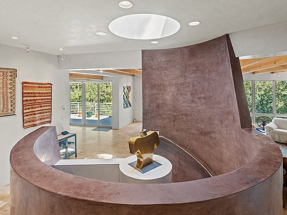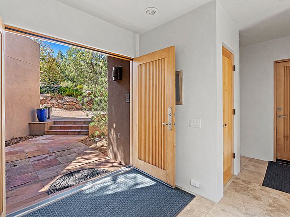 Discover serene luxury in this contemporary retreat, perfectly nestled among majestic pines. You are welcomed by a stunning spiral staircase and Anasazi stone accent wall, setting a dramatic tone. Venetian plaster walls, Travertine tile flooring with radiant heating, and beamed ceilings span the living spaces. Expansive windows and a spacious outdoor deck frame gorgeous views of the Sangre de Cristo Mountains. The gourmet kitchen, outfitted with premium appliances and a butler’s pantry, is designed for effortless entertaining. The thoughtfully separated primary suite on the lower level includes an additional living space or library. The primary bedroom features a cozy sitting area/office, a spa-inspired bathroom, and the convenience of a second washer and dryer. The guest wing includes two additional bedrooms and a bathroom, located opposite the main entry. This home seamlessly blends tranquility and quiet luxury, all while being just a quick drive to Downtown, Canyon Road, the Santa Fe Opera, and Ski Santa Fe.