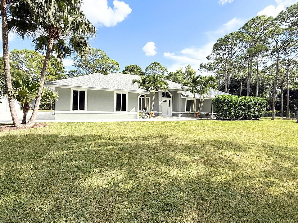 NEW LOOK, NEW FACE, AND PRICED TO SELL!Zoned for Top Rated Schools, 1 ACRE, remodeled and furnished estate home in Palm Beach Country Estates. Move-in ready, fully irrigated lot in this highly sought-after NON-HOA community, the home features a full interior renovation with updated finishes, fresh paint, NEW POOL w/modern pergola, NEWER ROOF and quality furnishings included. 4 Car detached garage can easily be converted into guest cottage resting on a 5,800 sqft concrete poured drive way!, Open living spaces, split floor plan and a modern design throughout. Located minutes from shopping, dining, entertainment, beaches, and top-rated schools. The only fully remodeled and furnished home currently available. Don't miss you chance to see this one!