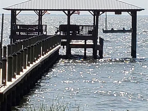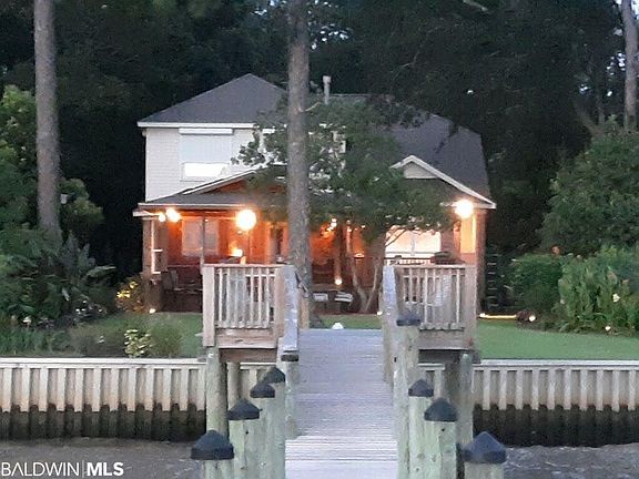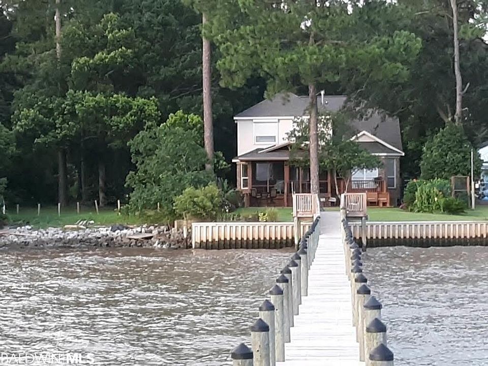 Looking over Mobile Bay, this brick home features 180 degree views of sunsets from the porch that faces the bay. The lot size is fifty feet of Mobile Bay frontage. This home includes four spacious bedrooms plus an office which looks out to the bay, tiled kitchen with stainless steel appliances, two heating units and A/C systems, wood floors with carpet in the bedroom, and a vaulted living room ceiling with lots of natural light from the large upper windows. The master bedroom views the bay. The extra large windows. Sellers flood insurance is $1200 a year. Recently replaced bronze fortified roof and recently painted interior. The home has a screened, covered, and skylighted bay facing porch, a large deck with built in seating below. A two plus covered car parking area, separate enclosed storage, a central vacuum system and sprinkler system. House is wired for security system and cable. An aluminum seawall was installed after hurricane Lawrence 2005,. Recently, a new solar lighted pier and boathouse have been built. The north side of the house is adjacent to a 50+ foot Baldwin County public access for swimming and kayaks only. pier (over 250 feet) and a boathouse. New oven and microwave