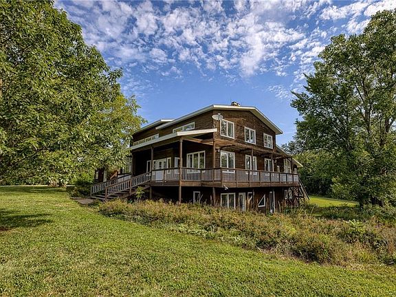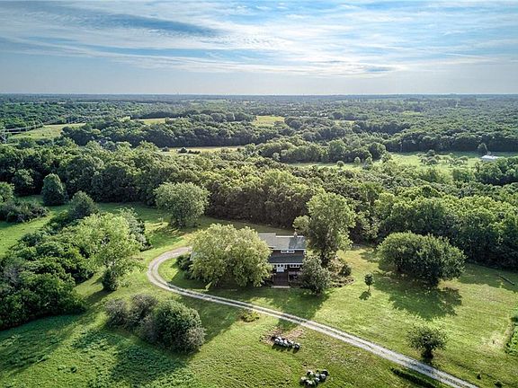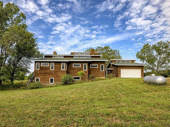 Welcome to this completely secluded, custom-designed contemporary home nestled on 42 acres of serene countryside. The unique, architecturally striking living room, featuring soaring 20+ foot ceilings and a functioning wood fireplace, makes for a beautiful space to entertain groups both large and small. Custom designed and nestled into a hilltop prairie, this home is backed by a forest with a creek passing through it. Beautiful sunset views can be enjoyed from the large wrap-around porch. Large windows let in beautiful light throughout the entire day, enhancing the natural beauty of the surroundings.