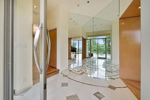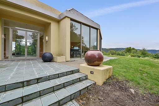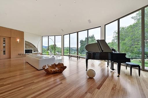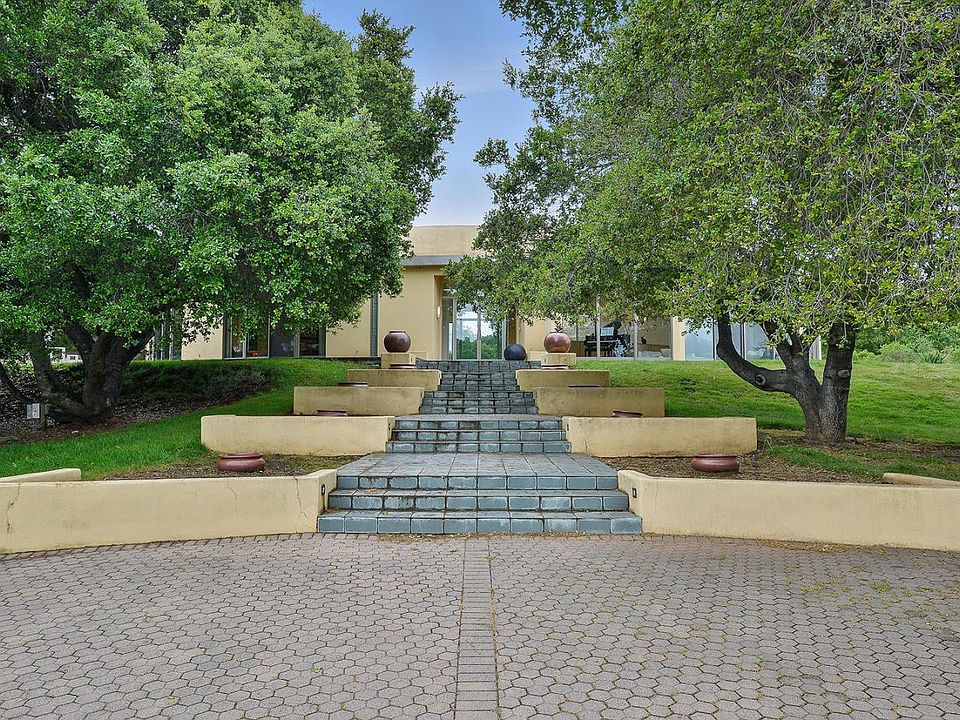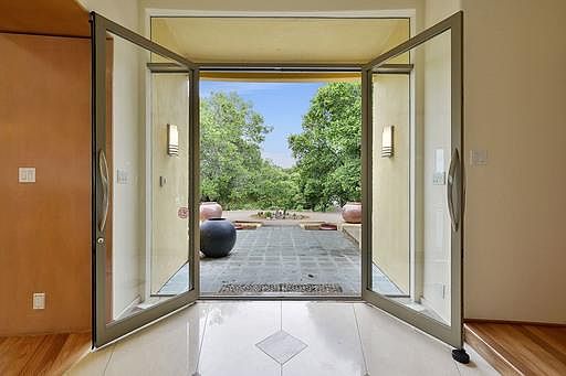 This stunning home nestles in an oak knoll on a private street in the Saratoga Hills. Its unique form a diamond ring predates the iconic Apple structure. Floor to ceiling baguettes of glass walls provide unparalleled views of the interior courtyard, the oaks and mountain ridges, and THE Bay Area. Inside and throughout, there is an uncommon natural light, and striking architectural features. The fireplaces and counters are a rare and beautiful stone; the floors and cabinets are a warm luxurious wood, the light fixtures are graceful Murano flowers. The large living room is the showpiece solitaire. The gourmet kitchen has a grand piano of an island,, high end appliances, and lots of storage. The butlers kitchen allows courtyard parties to be unobtrusively serviced. The theater is where you run on a treadmill and watch Casablanca, after which you recover in a steam bath or a Japanese soaking tub.