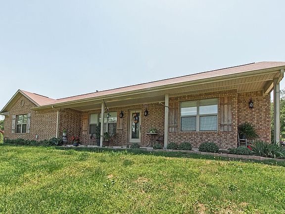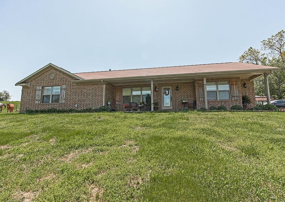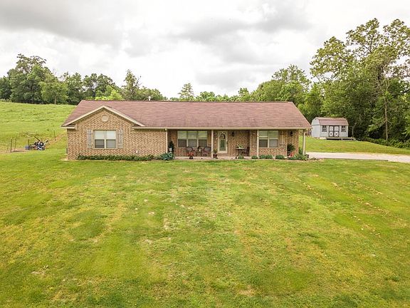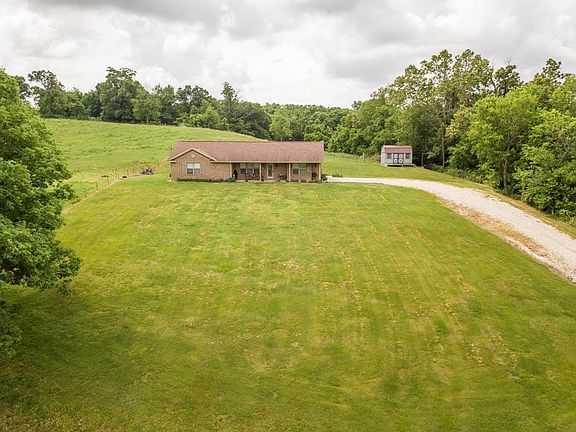COUNTRY COMFY! AMAZING VIEW! Soothing country setting, 2011-built home on 5.35 acres features full brick exterior, covered front porch and back patio! Interior offers well maintained home with adaptable floorplan, TONS of kitchen cabinets, kitchen island/breakfast bar & stainless appliances, full pantry, recessed can lighting in living/dining/kitchen, vaulted ceiling in LR, tray ceiling with crown molding in dining, BRs carpeted w/ceiling fans, tiled walk-in shower in master bath. Outbuildings for storage. Sip lemonade and watch horses graze on verdant rolling hills from your front porch!