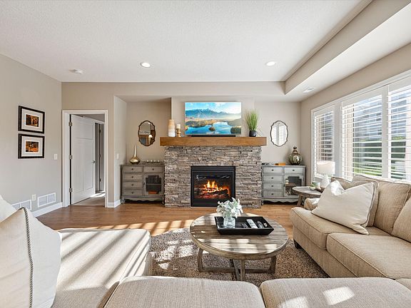 Gorgeous low-maintenance villa home with main level living & rare 3 car garage on an oversized lot! Enter the home & be greeted by the flex room - perfect for office/sitting room leading to a beautiful & open living room, dining room & kitchen featuring walk-in pantry & large center island! High-end flooring, plantation shutters & natural wood bring warmth & inviting atmosphere as soon as you walk through the door. Main level primary bedroom boasts abundant natural light plus spacious walk-in closet & primary bathroom highlighted by a double vanity as well as a huge walk-in shower. You'll love the serene sunroom walks out to a large patio nestled with large lot and great privacy. Upper level has two bedrooms, full bathroom, flexible loft space & huge storage closet. Located on a cul-de-sac within charming neighborhood with great access to park & walking trails that lead to the Mississippi River! Say goodbye to the lawn mowing & snow removal - the association will take care of it all!