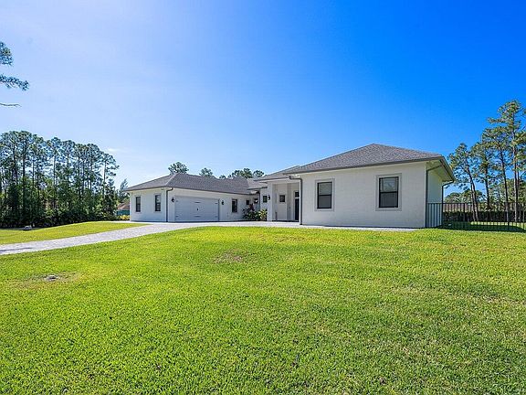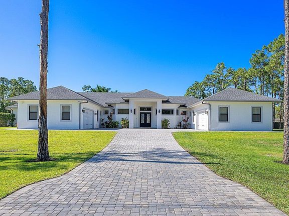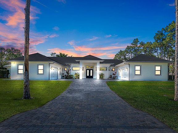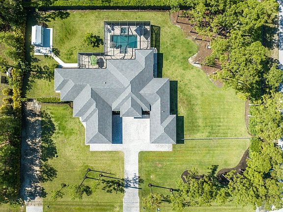 WELCOME HOME to sophistication, serenity, elegance, upgrades galore and executive style living times two! This unique like brand new home was custom built in 2018 and features; (5) bedrooms plus den, (5) full baths, (4) car attached garage, guest house/In-law suite, stunning saltwater pool and spa, defines exceptional taste, meticulously maintained, white glove clean, energy-efficient and where simple country living meets luxury. And all of this greatness is resting on a premium 1.72 acre corner lot that is on a paved road with sidewalk and equestrian trail. ENTERING the grand brick paver driveway and covered entry brings you into the Florida Iron front doors with privacy glass and glass panels that open independently for ventilation and easy cleaning and you are greeted by (CLICK) a spectacular pool view, 19' x 13' foyer, soaring 12' coffered ceiling, Murano glass pendant, spacious open living areas offering an abundance of natural light, ceramic tile wood look plank floors throughout and so much more! PASSING THROUGH you will discover outstanding features such as; pool view from virtually every room, oversized rooms, custom cabinetry by Pacillo's throughout, dream kitchen boasting; 48" solid wood custom cabinets with soft close drawers and doors, glass backsplash, undermount lighting, energy efficient stainless steel appliance package, spacious granite island with farmhouse sink, built in bar with lighting, built in shelves and cabinets, beverage fridge, 6ft wine fridge and wine rack, two built in slide out spice racks, walk-in pantry with custom shelving and much more! And hello gorgeous master suite featuring; a dedicated master a/c system, oversized his and hers walk-in closets with extensive custom built-ins, spectacular bath with his and her vanities, oversized sports shower with Hansgrohe Raindance S shower head in master bath and Hansgrohe shower heads and sprayers, spa stone bathroom floors and a relaxing pool and green space view. You will also discover 10' and 12' volume ceilings throughout, plantation shutters, marble and granite counters throughout, crown molding, 8' doors throughout, tray ceiling, custom closet shelving systems, Kichler fans, sliding glass barn door, dynamite split floor plan, beautiful color palette, bathroom niches, fine construction with a flat wall finish throughout main home, 6" colonial baseboards, spacious laundry rooms with cabinets and design that is simply exquisite! HELLO SAVINGS, PEACE OF MIND, CONVENIENCE & GUEST HOUSE/IN-LAW SUITE Home qualifies for the highest level of homeowner insurance discounts available and equates to over $18K! Hurricane impact windows and doors, elevated above flood plane and not located in a flood zone, full house reverse osmosis system, instant hot water recirculating system, fenced back yard and electric pet fence around entire perimeter w/ 3 transponders, complete smoke and carbon monoxide detection system, structured cabling, fully wired for high-speed internet, outdoor TV with motorized lift, second driveway, sprinkler system for entire lot w/automatic timer and rain sensor, custom grilling station, 10'x20' shed with concrete slab, ac and electric, whole house gutter system, comfort height toilets throughout, dimmers throughout, surround sound speakers inside and outside, epoxy garage floors, no HOA fees and the following smart home features; pool- Pentair/screen logic app access, (3) security alarm systems, (15) color video cameras, motion detected Ring light/camera, Ring doorbells, Nest thermostats, indoor and outdoor lighting access control and in main house- Samsung large capacity smart washer/dryer. GUEST HOUSE/IN-LAW SUITE features a separate front door entrance and not your average guest house! Upgrades throughout, textured granite in kitchen and bathrooms, granite farmhouse sink, built in wine fridge, stainless steel appliance package, oversized master bedroom closet with built in shelving, bed 2/den has a built in murphy bed, discreetly designed for mobility impaired and partially ADA compliant (zero step down throughout house) Knox box rapid access system provides non destructive emergency access, master bedroom shower w/built in seat, master bathroom custom armoire, safety hand rails in all bathrooms, separate ac/heating system and note: bed 2 does not have a closet and per the certified appraiser, "It meets all legal bedroom requirements and officially considered a bedroom." STEPPING OUTSIDE through the stacking sliding glass doors or the sliding glass doors that pocket seamlessly into the wall brings you to a relaxing paradise featuring; three lanai areas, expansive screened in patio with travertine marble deck, sparkling 15' x 30' heated pool with a cascading spa waterfall, sun shelf, tiled table top with umbrella sleeve and pedestal, led color lights, cabana bath, outside shower and surrounded by outdoor speakers, accent lighting, green space galore, pines and palms, fire pit and fully fenced backyard. Simply, a perfect space for family gatherings, entertaining and outdoor fun! LOCATION LOCATION LOCATION This gem is tucked away in a superb yet quiet Loxahatchee/Acreage location with shopping and dining just around the corner and nine quaint parks with countless year-round outdoor activities such as; free concerts at the community amphitheater, play grounds, picnic areas with grill pavilions, fishing, fitness trails, equestrian trails, football/baseball/Soccer fields, skate and equestrian parks, basketball/volleyball/racquetball, tennis and is located just minutes to everything one could possibly desire; Florida's Turnpike, I-95, Palm Beach international Airport, fine shopping and dining, arts, entertainment, world class equestrian shows and facilities, beaches, theater, golf, business and economic development, education, green living and much more! COME AND SEE why The Acreage/Loxahatchee is very sought after and take in the fresh country air and peaceful sounds of nature. Build a chicken coop, br
