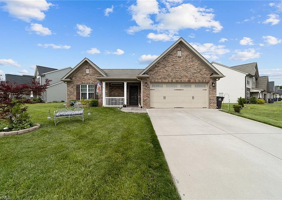 Shows like a model! Charming one-level home in the desirable Sedge Hollow subdivision, Kernersville! Experience the ease of the 3/2 Idlewild floorplan by Shugart (now Mungo Homes) featuring a spacious great room, tray-ceiling dining room, and eat-in kitchen with granite countertops. Immaculate condition with engineered hardwoods throughout (no carpet!). Enjoy a large double concrete patio (27.7x12) perfect for entertaining and a cozy front porch for relaxing afternoons. Corner, triangle lot offers great privacy between homes. Includes privacy fence, shed, and pergola. Prime location with quick I-40 access. Built in 2019 with builder’s structural warranty. Sidewalk-lined, walkable community.