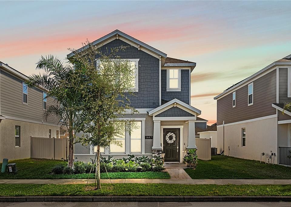 Check out this stunning 4 bedroom, 3.5 bathroom, 2 car garage home in the beautiful Waterside subdivision. This newly constructed home is loaded with personal upgrades throughout. It looks like a model home, from the hand-selected light fixtures to the designer ceiling fans! As you enter, you are greeted with high ceilings, an abundance of natural light, and an open floor plan perfect for entertaining. The gorgeous kitchen is a focal point from all areas downstairs. The kitchen features custom-painted hunter-green cabinets with gold hardware, stainless steel appliances, a new refrigerator, an island perfect for prep work or entertaining, a large closet pantry, and a custom built-in dry bar with a wine refrigerator. The great room is open to the kitchen and has ample space for a 6+ person table, a large buffet, a sectional sofa, a TV console, and more. The great room bathes in plenty of sunlight, with views of your private backyard patio area! One of your two primary suites is located downstairs and features a large walk-in closet, dual vanity sink, and shower. On the second floor there is a large loft for entertaining. The second primary suite features a large walk-in closet, dual sink vanity, and shower stall. You will also find another two bedrooms and an additional guest bathroom upstairs. Back downstairs, you'll find a fully fenced-in yard for extra privacy, a large paver patio with string lights, and a detached 2-car garage. This home also features leased solar panels and is located within close proximity to restaurants, shopping, and all that Winter Garden has to offer. Schedule your private showing today!