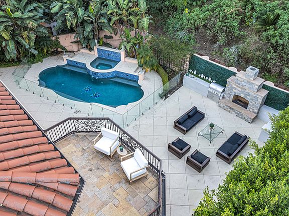 Private balconySerene waterfallResort-style backyardCustom cabinetryFenced-in poolExpansive primary suiteLush hedges