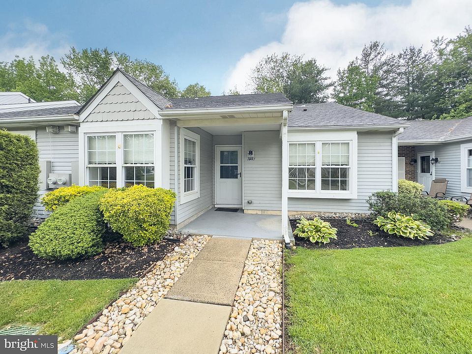 Great opportunity to have single level living in a “patio” style home in Mt Laurel’s Renaissance Club. This 2-bedroom home offers exterior maintenance free living in a desirable 55+ community that features a club house, pool and outdoor activities. The home’s front porch overlooks a green space that provides both curb appeal and privacy. Upon entry, the home’s kitchen is to your left and is bright with natural light from the two sets of windows at the front and offers plenty of cabinetry for storage as well as room for a café table and seating. The kitchen also has a large open pass through onto the dining and living room area, giving the kitchen a more open and social feeling to the other parts of the home. The living room and dining room are created from a large open space with vaulted ceiling to create a very welcoming space – perfect for entertaining. Off the living room is an enclosed full season room that is tiled and overlooks the private and treed open space adding to the overall living space of the home as well as delivering a sense of calm. The primary bedroom has a sliding door that brings in natural light and access to the 4-season room. This home offers a great opportunity to be move in ready or for you to put some personal touches in finishings to make it your own.