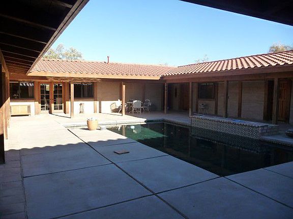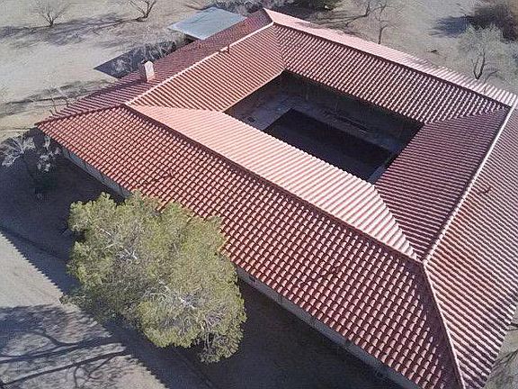 This home has new tile roof, 7 bedrooms + an art studio, four full bathrooms, three ¾ baths & two ½ baths....all in 3447 sq ft. As you enter the double doors to the courtyard, you will see the spa & pool with a waterfall. There is a covered veranda on all four sides of the courtyard. ALL THE BEDROOMS OPEN TO AN OUTSIDE AREA. Each bedroom has a bathroom attached. The grand living room has Saltillo tile floors, a 3-sided fireplace, large dining area, a reading room, ½ bath, wine cabinet & kitchen with an island. The house is on 2.5 acres with lots of Aleppo pines & desert willows, has natural gas, City water for the house & a shared well for the landscaping & pool, dual pane windows, separate heat/cooling in each room, French doors, cedar ceilings & large beams, one foot thick walls, 100 gallon natural gas water heater with a timer to circulate & a large storage area. This is an unusual home for the discerning buyer.