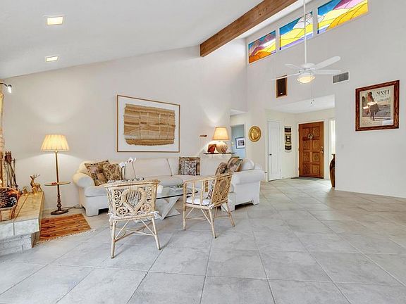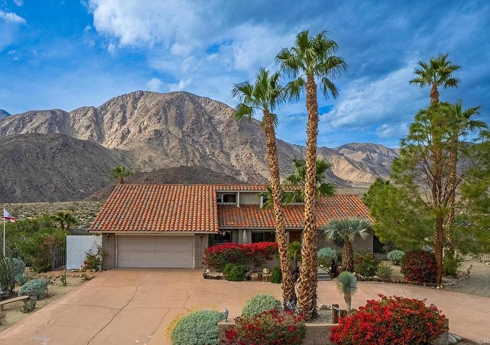 Charming home located in the De Anza Golf Estates with complete privacy on the rear and breathtaking views of the desert and surrounding mountains. Beautiful pool area with lush landscaping and Finnish sauna. Home features 3 bedrooms and 2 full baths with the master and 2 guest bedrooms on opposite sides of the house for privacy. Colorful stained glass clerestory windows give an artistic touch. Vaulted ceiling in living/dining room with large windows and sliders create an open and spacious feel that take advantage of the expansive views. No HOA.