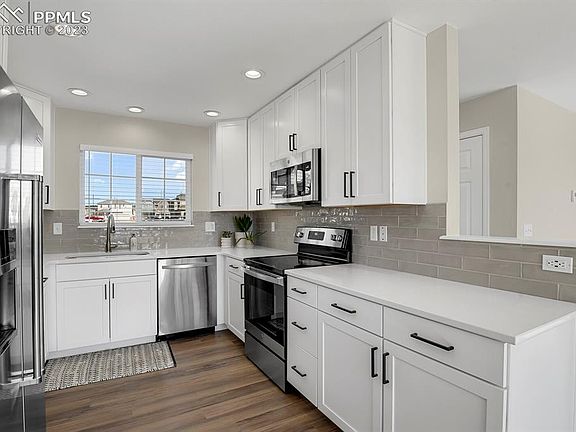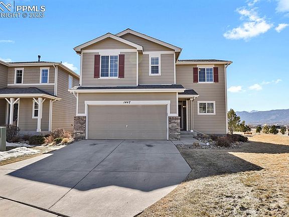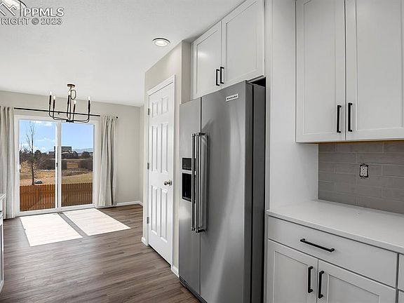 Tastefully updated single family home with 2 car attached garage. Kitchen improvements include new Shaker-style kitchen cabinets extended up to the ceiling for more storage space, Quartz countertops, new stainless refrigerator, microwave, & range, new sink & faucet,& new LVP flooring. Decorative concrete tile flooring in powder bath. Upper loft with Pikes Peak views provides a nice secondary living space for tv watching, gaming, play area, or office space. Primary bedroom with attached updated bathroom with comfort heights vanity, new sink, faucet, & toilet, new tile flooring, & subway tile shower surround. 2 additional bedrooms share a full bath upstairs with new vanity, sink, & faucet, & subway tile surround. Close to parks & trails. Quite neighborhood. New water heater, new A/C, new lighting.