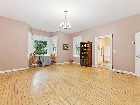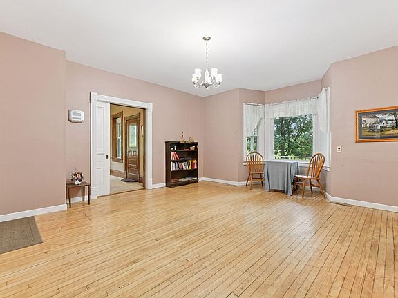Historic Charm meets Country Living in this 1902 farmhouse with 2,350 finished sq. ft., plus a walkup attic, and new block basement in 2009 adding structural peace of mind and future finishing possibilities. This 4-bedroom, 2 bath home is full of original character with the woodwork, wood floors, double staircases, formal dining room, pocket doors, many original built-in's, bay windows, to showcase the craftsmanship of a bygone era. The newly painted home offers main floor laundry, open staircase to the upper level with 3 bedrooms plus a spacious 21x17 bonus room between two bedrooms that could be a bedroom suite, wood floors under living room carpet, egress window in the basement offering many possibilities. The moment you arrive, the inviting covered front porch sets the tone for classic comfort and warm welcomes. This property is rich in character, space and potential whether you're drawn to historic details or looking for space to create your dream rural retreat, this home is brimming with character waiting to be restored to its former glory. The 5 acres includes woods on the North and West to provide a great windbreak. The lean-to offers garage or storage space.