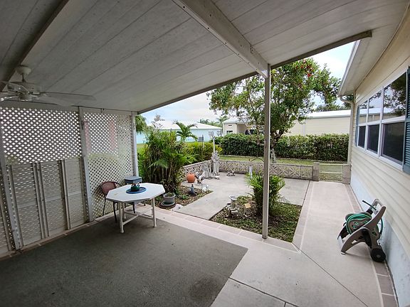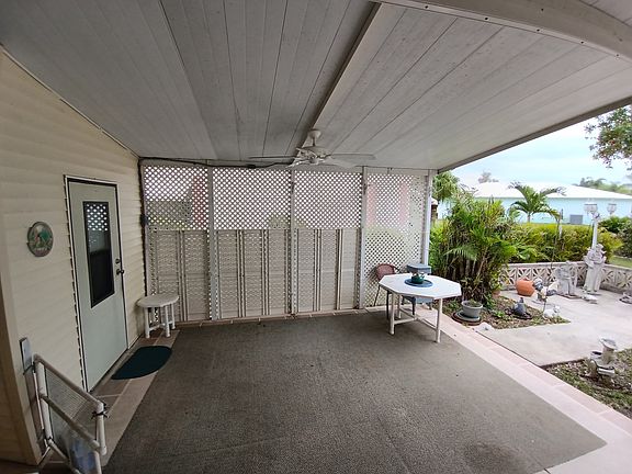 PRIVATE OASIS WITH MASSIVE ADDITION! 2 bed 2 bath 1,468 sq.ft. which includes a massive 532 sq.ft addition with hurricane impact windows and drywall throughout! This addition has its own air conditioner as well. Both A/C's for the house were newly installed in 2022! This home sits in Spanish Lakes Fairways 55+ community in Fort Pierce Florida. Lot rent is currently $931.00 and THE USE OF THE PARKS AMAZING AMENITIES - GOLF**2 POOLS**TENNIS**PICKLEBALL**HORSESHOES**SHUFFLEBOARD**FITNESS CENTER** Also includes basic lawn and trash service **Being sold MOSTLY FURNISHED** THIS HOME IS IN A PET SECTION! The backyard has a large concrete patio that is perfect for your own garden paradise. Large hedges provide tons of privacy from neighbors. The shed is equipped with a washer and dryer that is included with the sale. Upon walking into the front door you are greeted with a spacious living area that leads to a split bedroom floorplan. The kitchen is equipped with ample storage and counterspace as well as a breakfast area with large built ins. From the kitchen you will be impressed with the enormous addition to the back of the home with another main entrance. The house is being sold mostly furnished. Call today to schedule a showing or make an offer! All listing information is deemed reliable but not guaranteed and should be independently verified through personal inspection by appropriate professionals. Our company does not and cannot guarantee or warrant the accuracy of this information or condition of this property. Measurements are approximate. The buyer assumes full responsibility for obtaining all current rates of lot rent, fees, and pass-on costs. Additionally, the buyer is responsible for obtaining all rules, regulations, pet policies, etc., associated with the community, park, or home from the community/park manager. Our company is not responsible for quoting said fees or policies.