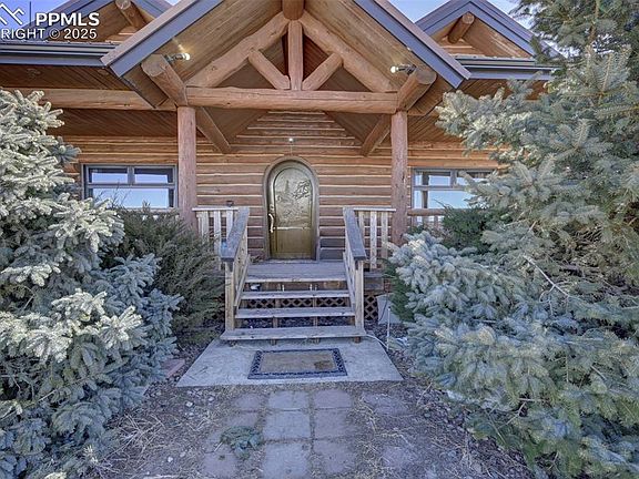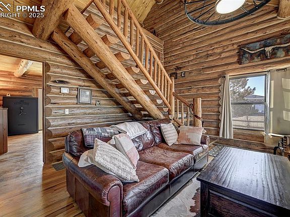Nestled just off a paved road, this beautiful log home sits on just over 40 acres and offers a serene and picturesque living, only 24 minutes from Falcon. Step inside to discover hardwood flooring throughout the main level. The home underwent complete window replacement in 2017, and new chinking has been applied, preserving the log home's insulation. The kitchen features a chef's station, wooden cabinets, and tile flooring. A brand-new flat top range installed in 2024, combined with a newer refrigerator (3 yrs old), makes this kitchen a dream for any cook. The Primary bedroom includes a Jack and Jill bath, a spacious walk-in closet and a walk-out wooden deck through French doors equipped with internal shades. Ascend to the loft, you'll find 2 two bedroom areas with upgraded stain master carpet. The newly remodeled bathroom features LVP flooring, a 3/4 shower, and double vanity. The fully finished basement includes 2 additional bedrooms with carpeted floors and windows with custom covers. The 10-foot ceilings create an open and airy atmosphere. Additionally, the home features metal roof, wood burning stove, French drain surrounding the foundation, large storage closet and utility room, security system, whole-house 200-amp generator, and owned propane tank. The expansive wrap-around wooden deck and a sidewalk leading to the back door offer ample outdoor space. The insulated garage, with a 45K BTU heater and garage door opener, includes attached shelving and cabinets. The shop has electric service and pass door, with additional carport on the side. The drive through pole barn includes a 60x120 paddock with six 15-foot stalls and auto waterers. The chicken coop measures 24x12 - has auto waterer. There are five outside hydrants for easy water access. The yard is fenced and the entire property is fenced and cross-fenced with beautiful mountain views! No windmills on property! Don’t miss this opportunity to own a piece of paradise!