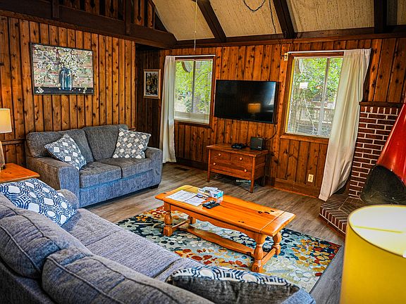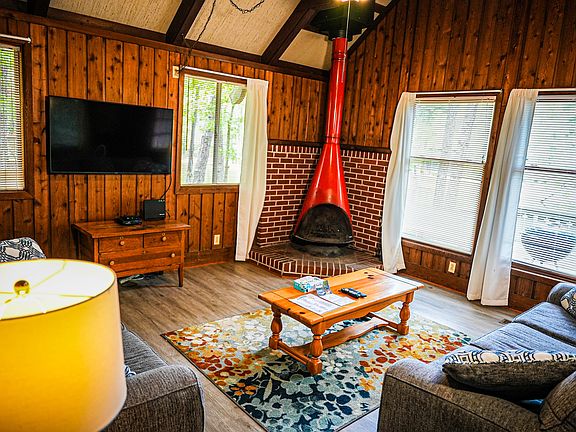 A cozy 3 bedroom, 2 bathroom chalet with a spacious open floor plan that is perfect families looking for a relaxing getaway. As you enter into Chalet 76, you will find a well-appointed kitchen fully furnished with everything you need to prepare meals during your stay. The living room features a comfortable seating area with a fireplace, perfect for those chilly mountain evenings. The dining area is adjacent to the living room and has plenty of space for everyone to enjoy meals together. The home is equipped with a washer and dryer, making it easy to keep up the laundry while on vacation. Additionally. the deck is equipped with a charcoal grill and a ramp, making outdoor dining and entertainment easy and accessible. Upstairs in the loft, you will find 2 full beds, while downstairs, there is a queen bedroom and a bedroom with a set of twins. Full access to all resort amenities. minimum of 25 years of age to rent. 12 month lease. Small dogs only- no other pets Tenant pays electric. (All other utilities included- water, internet, cable, trash pick up, grounds keeping, maintenance, and 24 hour security. All apart of the $300.00 utility package.) Up to two small dogs permitted- no other animals Max of 4 occupants to include children Must be able to pass credit & background check This home is located within a private resort. A security pass must be obtained to access property.