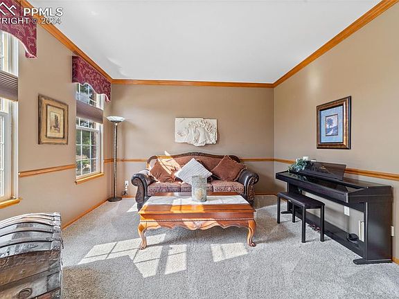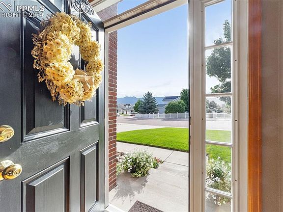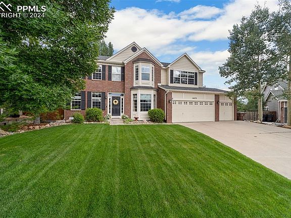 This stunning 4-bedroom, 3-bathroom home offers a warm and inviting space with an open floor plan perfect for your family and friends to enjoy. The impressive curb appeal with fully landscaped yard & well-maintained exterior will have you in awe. Upon entering you are met with beautiful finishes, high ceilings, crown molding, and gorgeous hardwood flooring, flanked by a formal dining room and living room. The kitchen was designed to accommodate all your culinary needs with stainless steel appliances, a cooking range on the center island, ample amount of cabinetry, granite tile countertops, and additional eating space with walkout to the oversized patio. The kitchen opens to a great room with vaulted ceilings, gas fireplace with mantle, and multiple windows overlooking the mature trees. The main level features a functional study that can be used as a main-level bedroom and is positioned next to a full bath. Upstairs, the primary suite is a true retreat with a spa-like bathroom featuring two vanities, walk-in shower, oversized tub, and an incredible, spacious walk-in closet. There are 3 additional bedrooms boasting walk-in closets in 2 and 1 with a custom closet and also 1 full bathroom providing comfort for all family or guests who stay. The huge unfinished basement is the perfect space for you to create your own canvas of how it can be finished or keep it for storage. The meticulously landscaped backyard is an escape from the hustle and bustle, with a covered deck area perfect for hosting gatherings or savoring moments of solitude. There is also a 3-car garage with enough room for your toys or storage. Enjoy being close to trails, shopping centers, restaurants, and an easy commute to the Air Force Academy. Don’t miss out on seeing this amazing property for yourself.